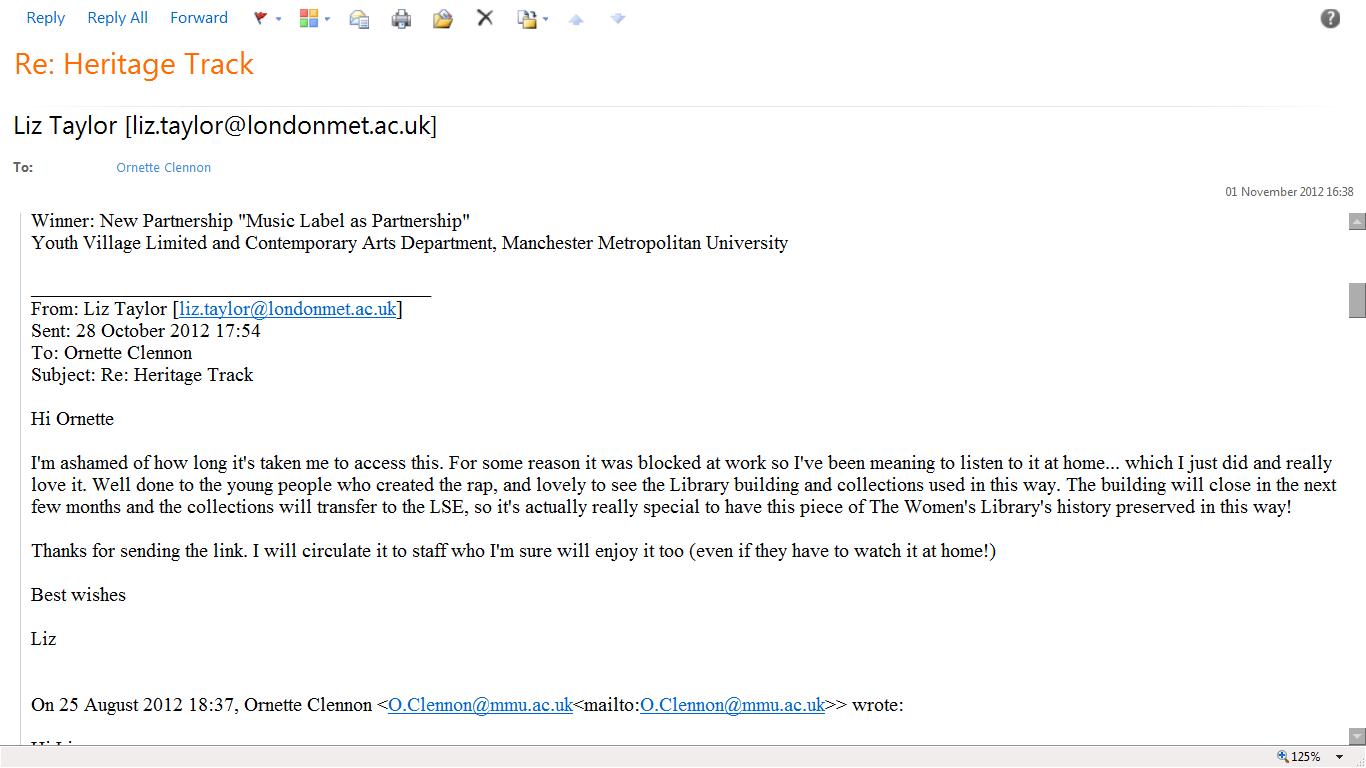 Recommendation from the Women’s Library: Taylor, L. (2012) Heritage Track. [email about the Young Musicians for Heritage Project] Message to Clennon, O. Sent 28.10.12.