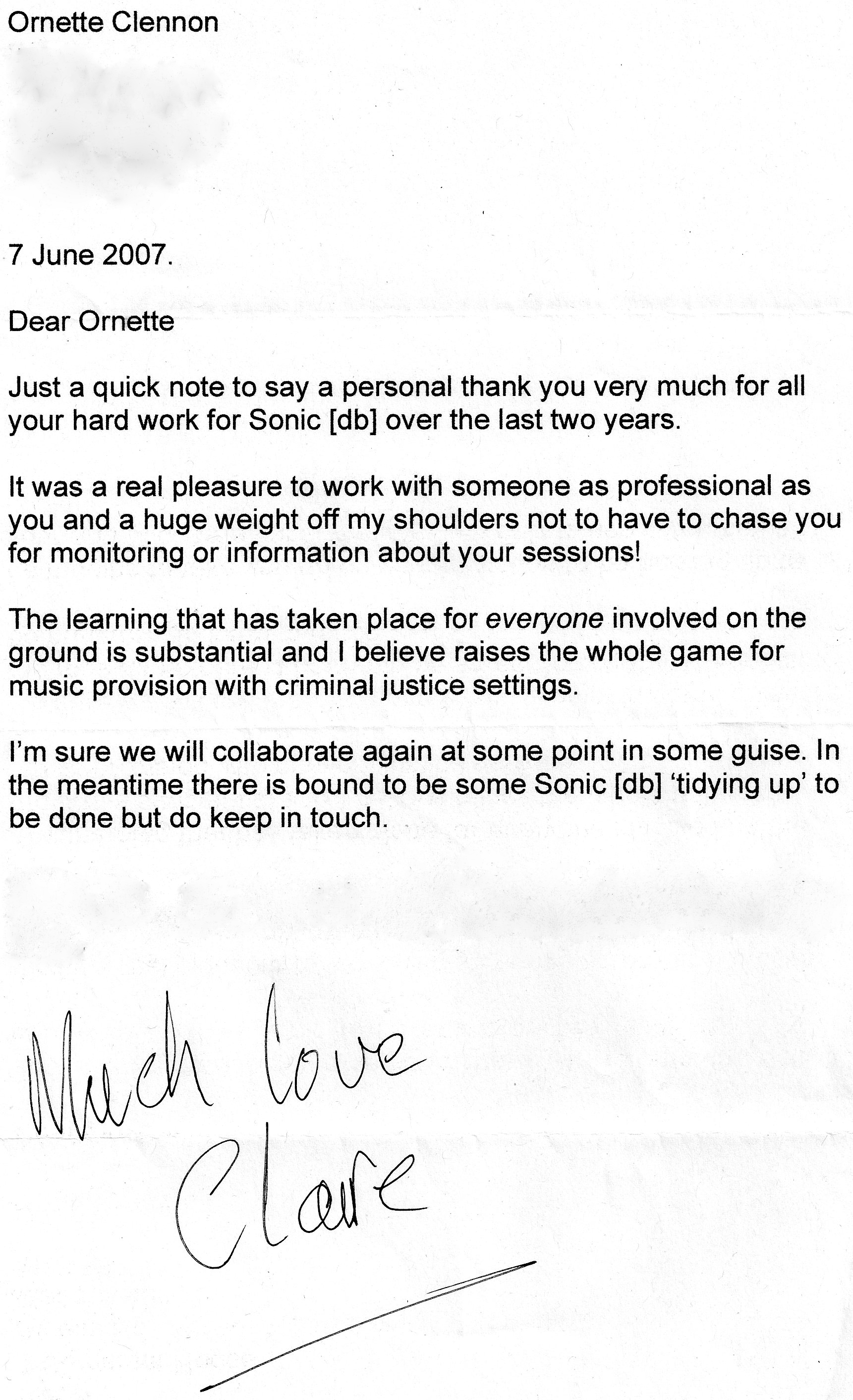 Recommendation from the Project Coordinator: Smith, C. (2007) [Sonic [db] Co-ordinator] HMPYOI Werrington [letter about my work on Sonic [db] Project] Letter to Clennon, O. Sent 7.6.07