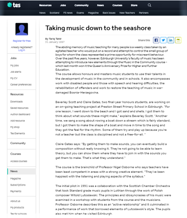 Edinburgh University 1991 – Piloted Music in the Community programme with Scottish Chamber Orchestra (Professor Nigel Osborne). For more details, see here and here.